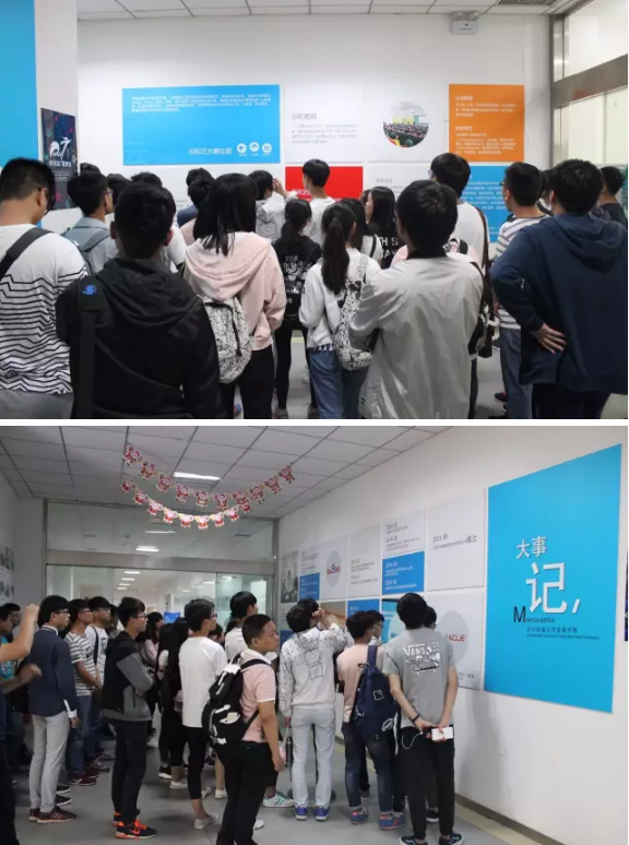 参观人数共计260余人,分为各个小分队由云和数据院校老师带领参观。在云和数据的接待前台,同学们似乎对云和数据的4家合作伙伴(Oracle、微软、unity、百度)非常感兴趣,纷纷拿出手机拍照。